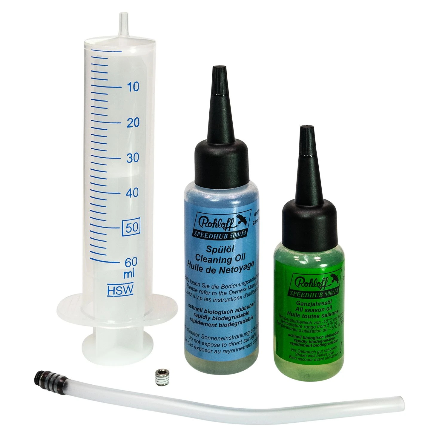 | Lieferumfang: | 25 ml Spülöl in 50 ml Flasche | 25 ml Rohloff SPEEDHUB OIL | Öleinfüllschlauch | Einwegspritze 50 ml | Ölablassschraube mit Dichtmittel |